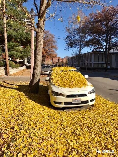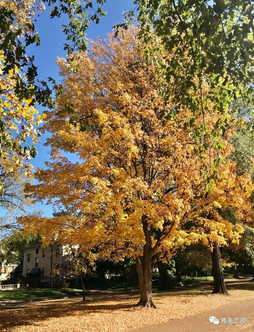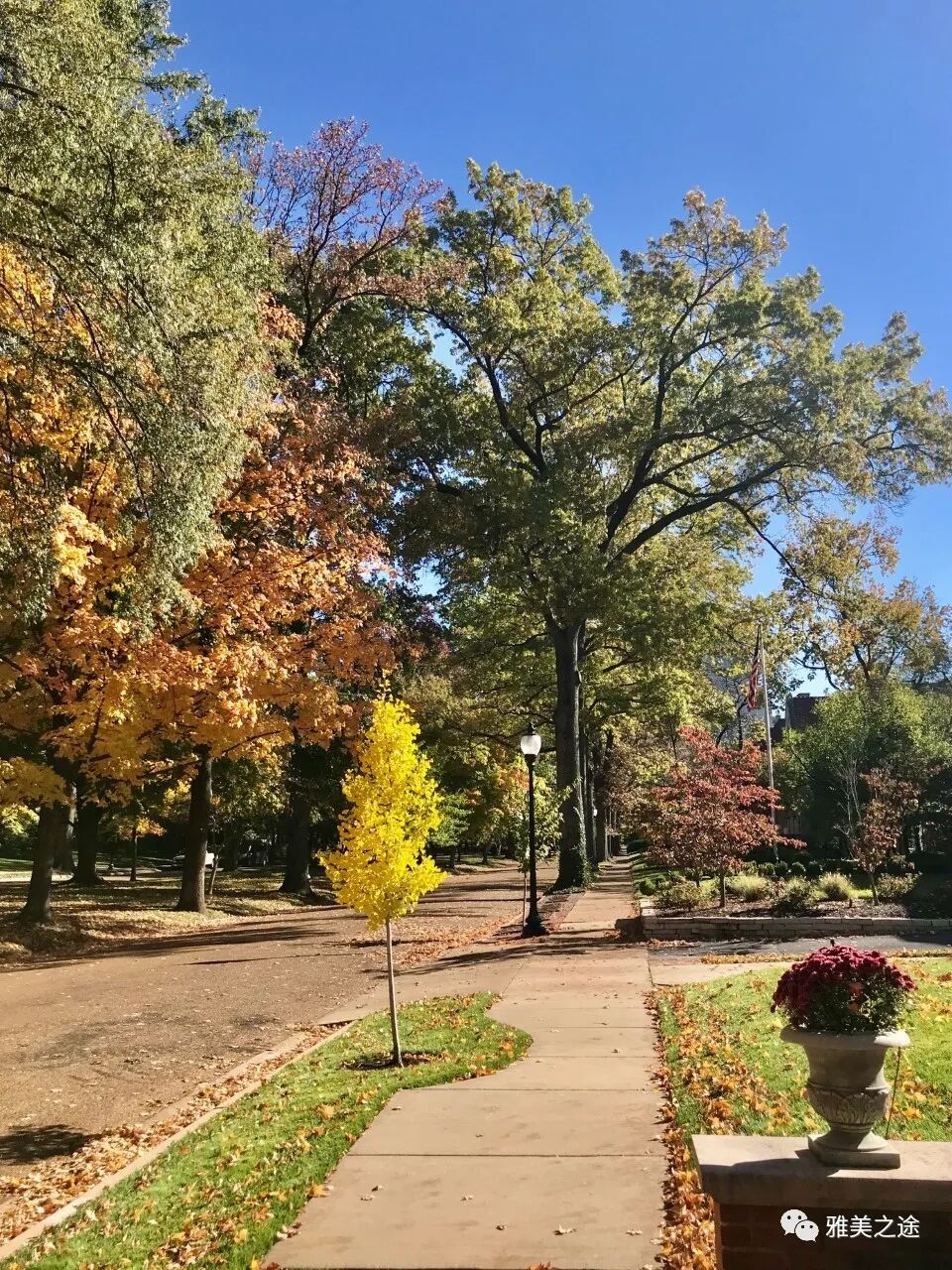 这里树种的选择考虑到相当的多样性,红叶与黄叶的外观肯定是因为里面的色素不同决定的,什么时候落叶也有生物钟的控制。古董社区中间那相当于至少两轮高速公路的绿化带为董事会的功劳,临马路的草坪也不是自家的,但是种什么树可以与董事会讨论,古董房周围的树种则完全是自家的品味。我还拍到一颗很小的银杏树,它们的浅黄色树叶只在11月的某天统一谢幕,圣路易斯华大图书馆的东侧也有两排这样的银杏树。