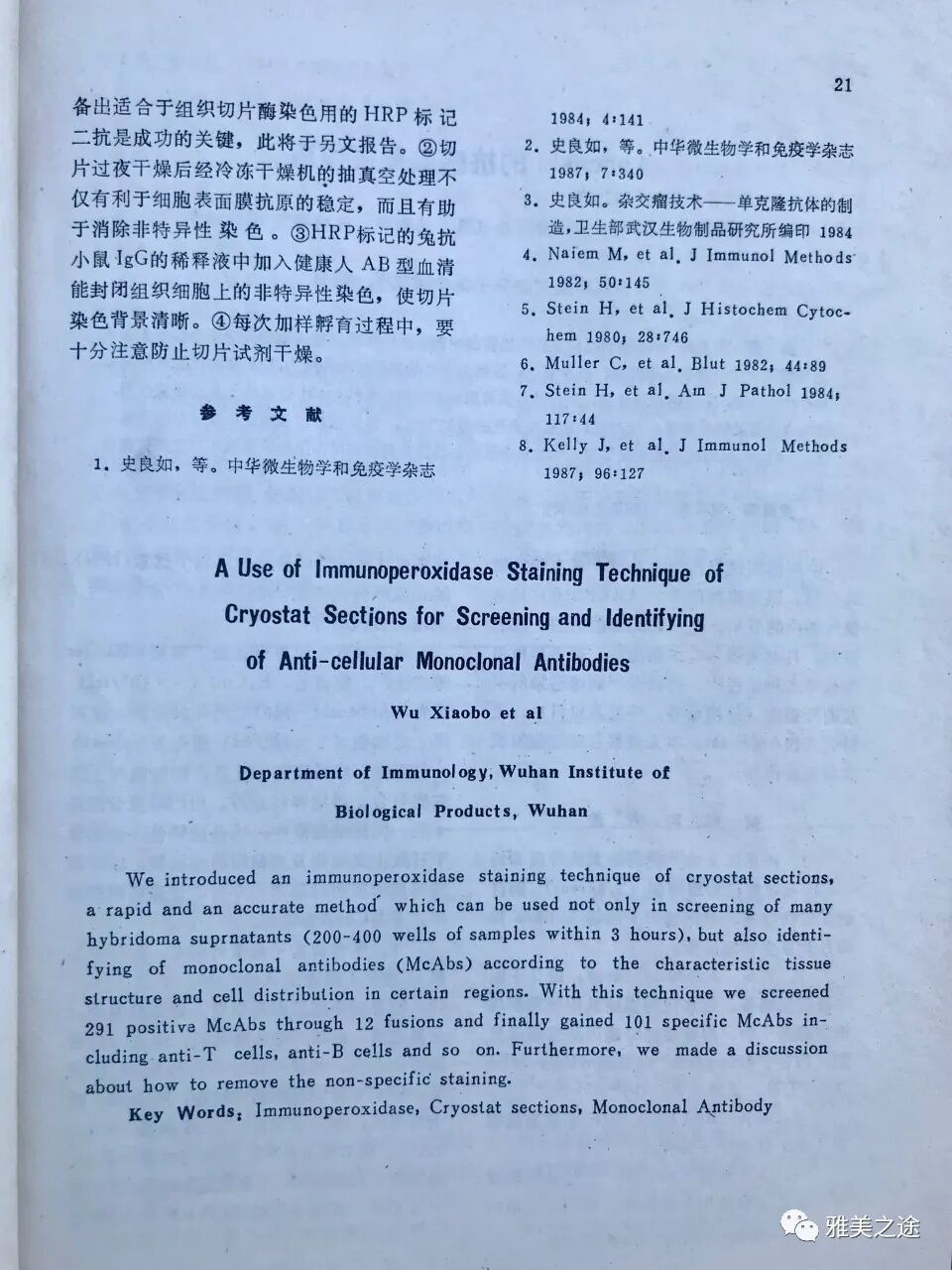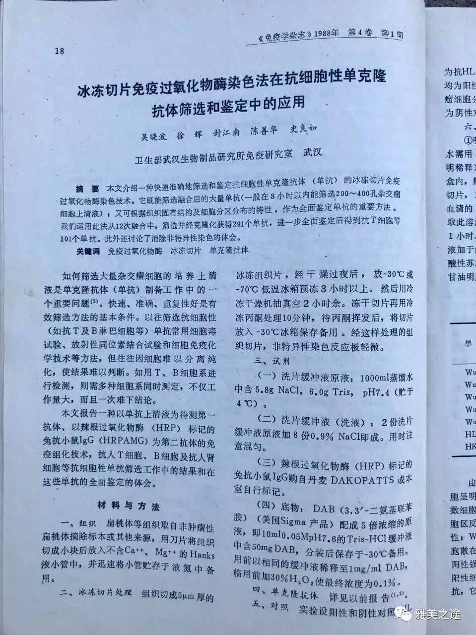 当时史老师刚从德国著名的杜平根大学回来不久,从德国带回了大量的杂交瘤细胞株,那是他在德国日夜工作的成果。我们也可以看出当年德国人是多么地慷慨,允许中国学者把初步材料带回国,当时从美国回国的学者也是大包小包地把实验材料运往中国,只有现在川普当局才把它们当成国家安全的高度。但是史老师带回来的抗体仍然需要再做鉴定,这篇文章就是当时鉴定的结果之一,当时我仅从医学院毕业了一年半,就以第一作者将文章发表在重庆办的《免疫学杂志》上,另外还有三篇分别发表在《中华微生物与免疫学杂志》和《上海免疫学杂志》上。