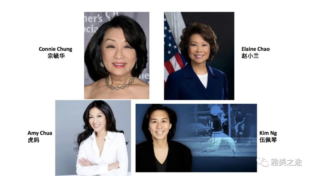 这几位美国杰出华裔女性的共同家庭成长经历,就是在她们的家里都没有男孩。你可以说这是巧合,但是这在成功华裔女性的聚集现象是不争的事实,本身华裔在美国有这般程度成功的也不多。天下父母也要注意了,她们四位只有虎妈生了孩子,其他三位都没有孩子。宗毓华为了与犹太丈夫生孩子还特别减低了工作量,也是以失败而告终,可能当选美国副总统的哈里斯也没有孩子,这难道是她们在职场成功所付出的代价?我对这四位华裔女性的故事都有所了解,她们固然背景不同,但是她们的父母都有过盼望儿子的过程,也相应地培养她们拥有一些男性对事业的追求,这在虎妈、赵小兰和宗毓华的成长史中都有过描述。