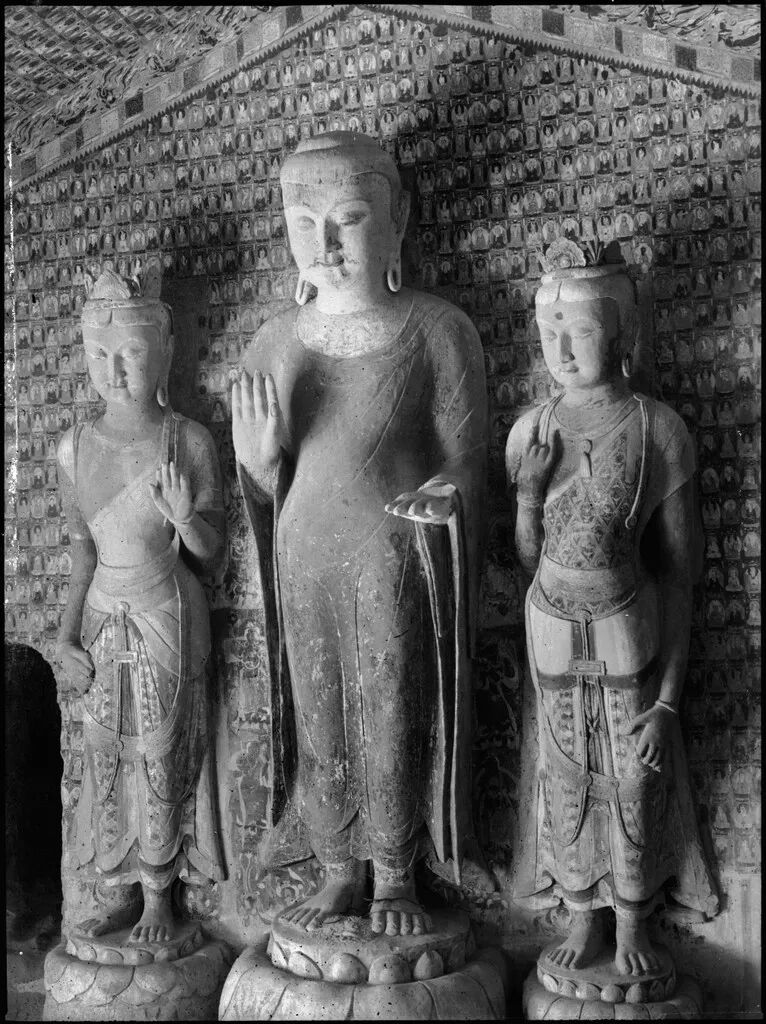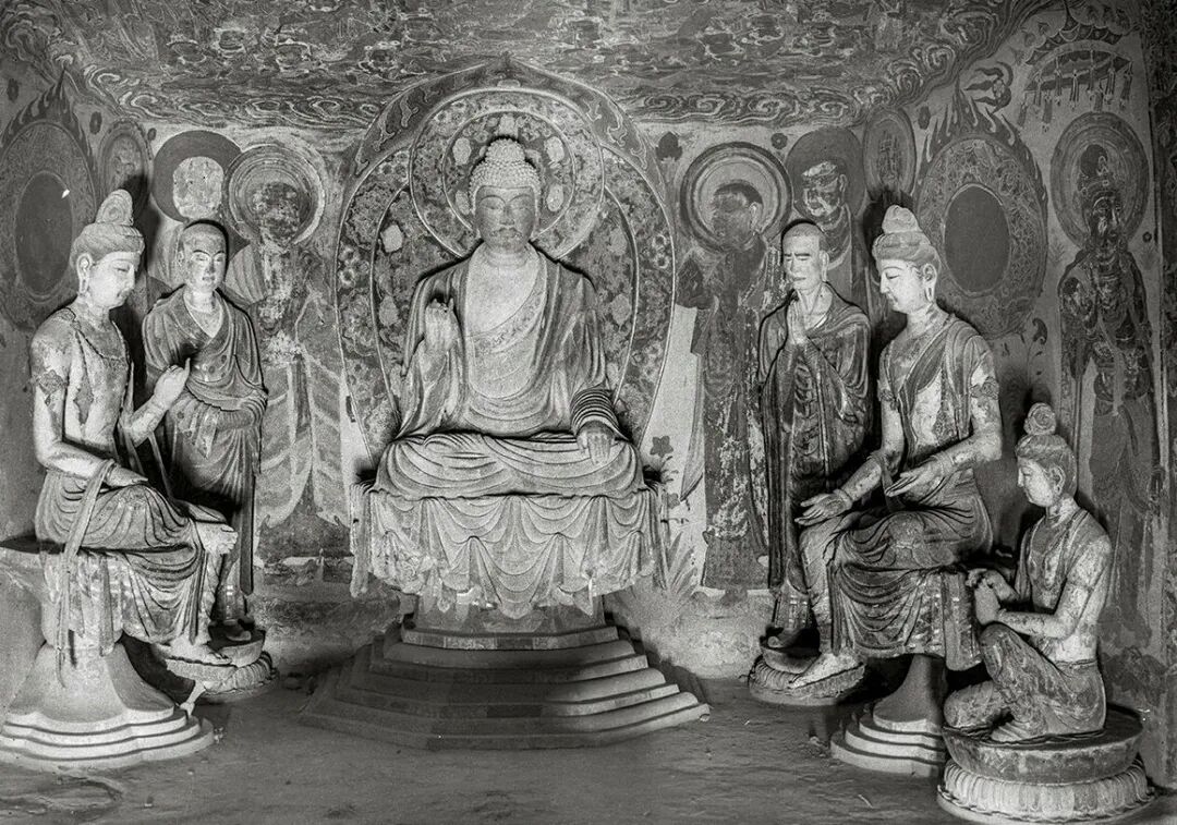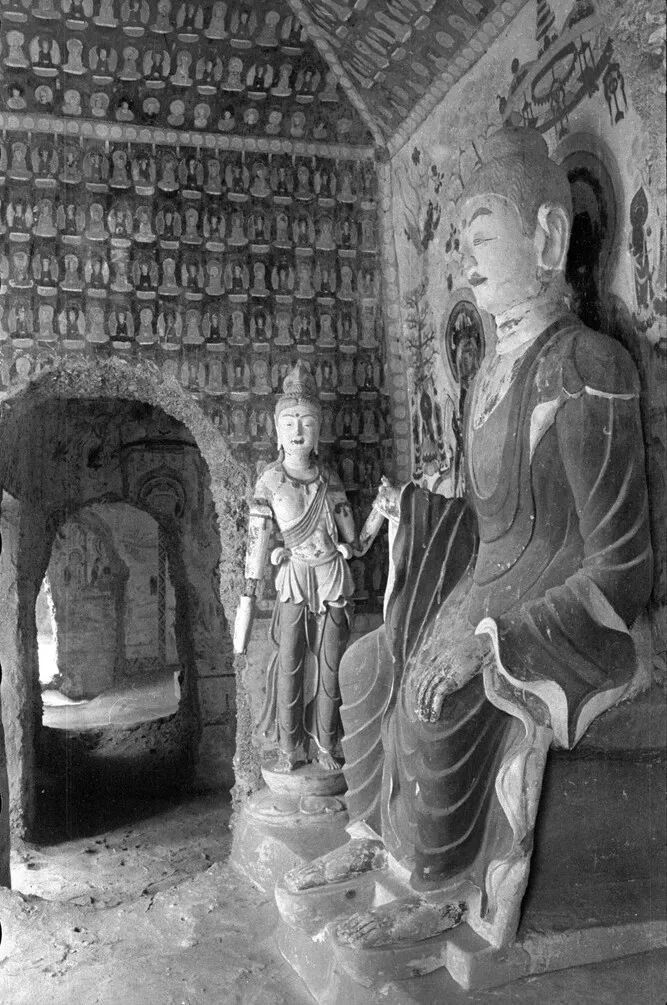 以莫高窟来说,1924年,华尔纳在328窟盗走一尊菩萨像并截取了壁画的局部。罗寄梅在此拍摄时,或许是为了避免显露出被移走佛像的空位,因而没有采用居中对称的构图。
