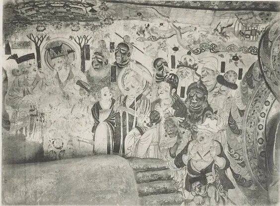 同样是在158窟,伯希和的摄影师Charles Nouette (1869-1910)因为难以拍摄完整侧卧的涅槃佛,而将镜头聚焦在了其身后的壁画上。