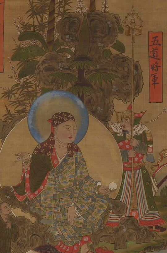 地藏信仰興起之後,五道大神或者五道將軍作爲地藏菩薩的侍從出現在佛教美術中。最爲典型的就是美國華盛頓弗利爾美術館(Freer Gallery of Art)保存的敦煌絹畫披帽地藏圖(編號F1935.11)。這是原清葉昌熾舊藏的于闐金玉公主供養《地藏菩薩像》。地藏頭被風帽,手拿寶珠,其右側有一將軍,手持長矛,腰帶弓箭,榜題“五道將軍”。這時候的五道大神或者五道將軍,依然是武士裝扮,而且腰帶弓箭,跟犍陀羅浮雕中的賁識有類似的地方。更重要的是,他手持長矛的形象,跟北魏樊奴子造像碑上手持長矛的五道大神形象如出一轍。