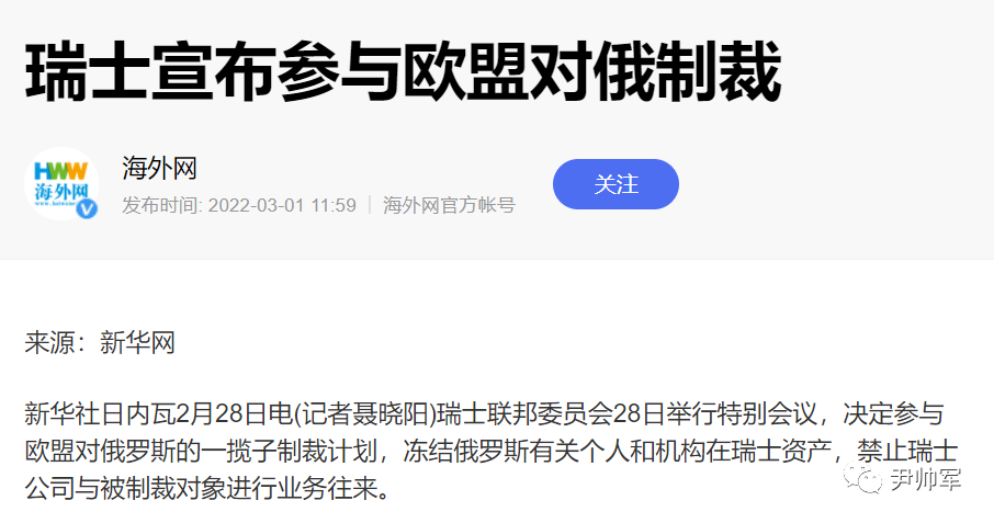 不仅英美、欧盟开始制裁俄罗斯,就连已经中立了200多年的瑞士,在没有联合国安理会授权的情况下,也开始冻结俄罗斯的资产。