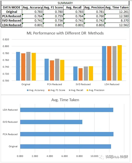对于回归任务,我们发现PCA通常比SVD表现得更好。在分类的情况下,LDA优于SVD和PCA,以及原始数据集。线性判别分析(LDA)在分类任务中始终击败主成分分析(PCA)的这个是很重要的,但这并不意味着LDA在一般情况下是一种更好的技术。这是因为LDA是一种监督学习算法,它依赖于有标签的数据来定位数据中最具鉴别性的特征,而PCA是一种无监督技术,它不需要有标签的数据,并寻求在数据中保持尽可能多的方差。因此,PCA可能更适合于无监督的任务或可解释性至关重要的情况,而LDA可能更适合涉及标记数据的任务。