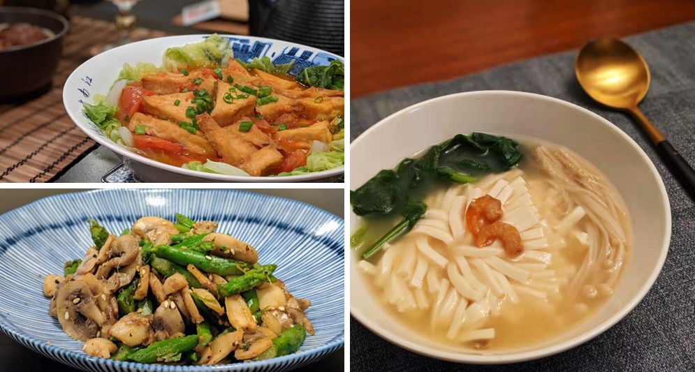 家庭小灶的素食:吊番茄汤煨菜、蘑菇煸芦笋,菊花豆腐羹