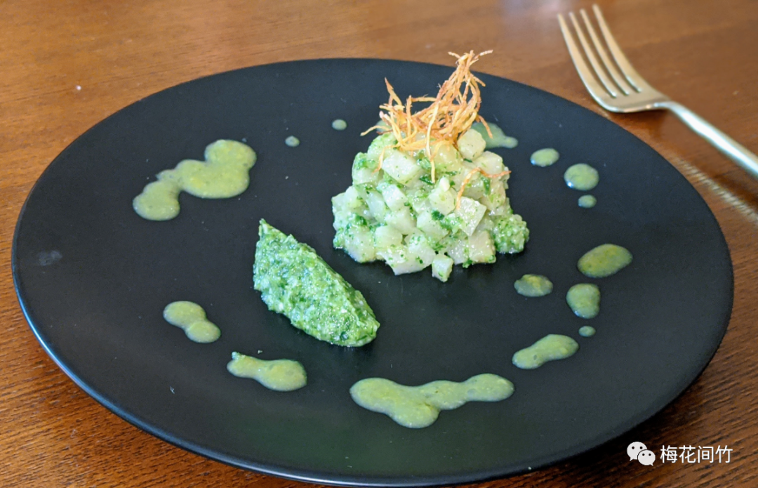 但是这顿饭里,随着每一道菜端上来,心情逐步从惊艳于“哇,还能有这种操作”,到猜想“咦,不知道能玩出什么花样”,直到最后“不猜了不猜了,完全超过了我的想象力极限,躺平了享受吧。”这道魳鱼本是经典的日式冷盘,但小球以粤式葱姜酱汁为底,辅之以独特的香料包裹起鱼肉的汁水,回味无穷。打个不恰当的比喻,你永远猜不到小球下一道菜会用什么方式让你爽上天,就像你永远猜不到特朗普下一秒会说什么狗屁话把你气上天一样。
