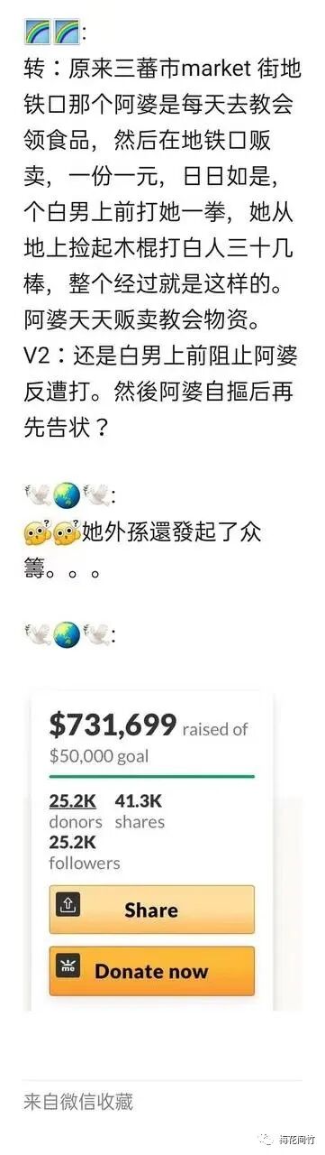 - 旧金山被白人男子打、抄棍反击的老太太每天去教会领免费食品出去卖,白男上前劝阻反而被打,老太太还先告状;