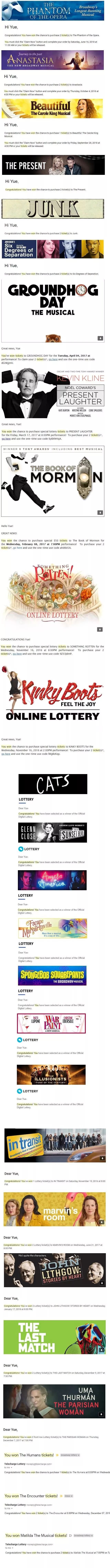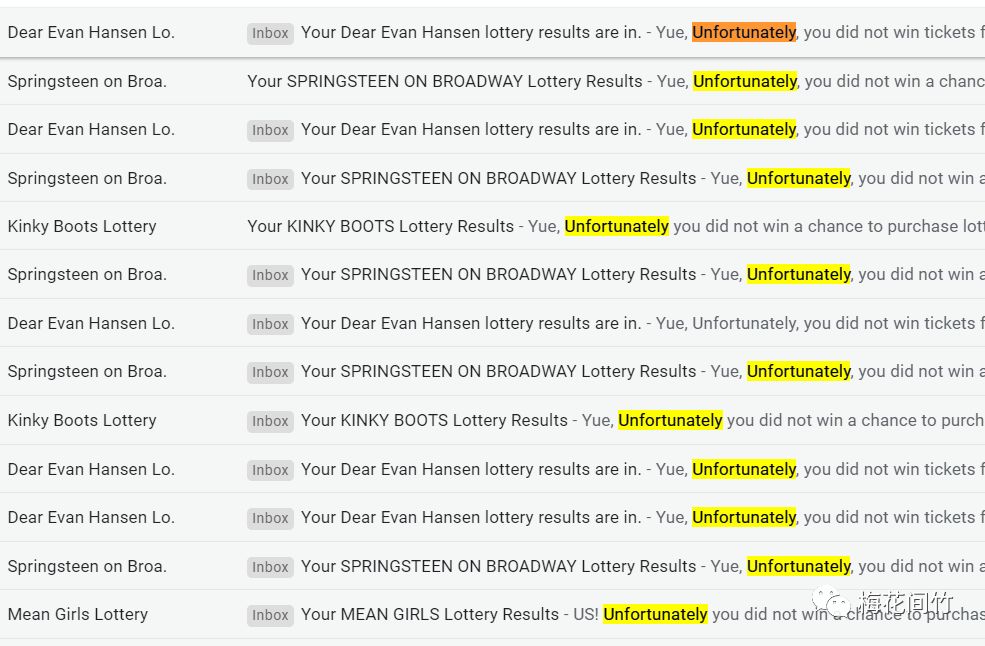 明明是因为我能记得孜孜不倦地每天抽,并且已经承受了10000+封 "Unfortunately, you didn't win the tickets for XXX. Try again”开头的邮件啊!只见贼吃肉,不见贼挨打。所谓锦鲤的修炼,就是用足够大的分母来堆出分子,上万个分母才能有几十个分子,说出来都是泪。毕竟,天天买彩票也是要钱的,但天天抽百老汇又不要钱,所有沉没成本也就只有一天一两分钟的时间而已。