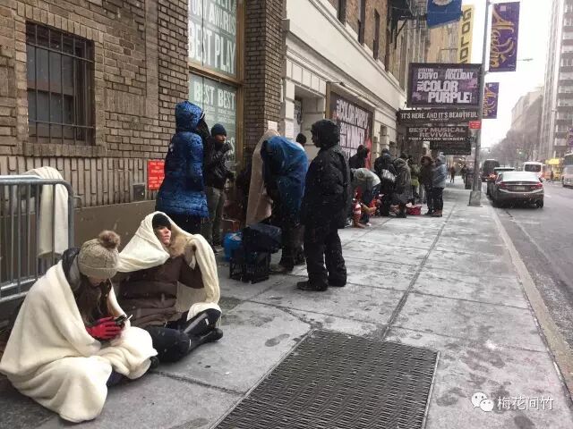不是所有的剧都有rush的票(具体哪些剧有rush,后面会讲到)。只要查到这个剧提供rush票,就去这个剧的剧场门口排队就行了。地址搜“剧名+box office”,绝大多数剧场都是平时早上10点、周日中午12点开门。排rush,最大的代价在于要早起,以及不可预测的天气因素,比如下大雪……因剧而异,热门一些的剧要提前一小时到数小时不等,不太热门的踩着点去就行。而那些快要下线的剧,不管本身什么质量,下映前两三周都会开始排长龙。拖延症真的是宇宙难以解决的难题啊!既然聊排队,这里我就捎带手,把著名的TKTS也说一下吧。