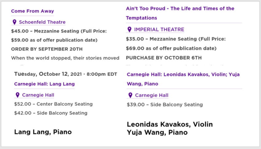 )常年都有各种打折票发售,从百老汇、歌剧、芭蕾舞到NBA、棒球、冰球一应俱全。缺点也是有的,首先你得是NYU的学生或者认识NYU的学生(我在学校时常年帮哥大的朋友代买票哈哈哈),一个人可以买4张;然后只买固定的场次,提前一两个月开卖,需要提前计划约好,同样不太适合不提前做功课的心血来潮的游客。座位不是很靠前,但是毕竟便宜,而且有一些市面上几乎没有其他优惠途径的票,为了银子,还希求什么呢?而且,有时候,Box Office莫名其妙的经常放免费的票,免费啊同志们!而且座位还很好,只不过放送时间不定时,经常通过一些神奇的邮件发送。多注册几个Newsletter没亏的呀。文章开始的表格里,我的大部分$0的剧都来自NYU,在毕业以后都时常能收到。Broadway Week当然也是百老汇迷们每年都要期盼的盛会啦,多数剧目全场买一送一,买一送一啊同志们!为什么会有百老汇周呢?因为百老汇最主力的观众是游客,那么在每年暑假和圣诞新年两个旅游旺季之后,不免会迎来淡季,那么索性薄利多销,回馈市民,每年在1月和9月推出每年两度的“买一送一”活动,受益的当然是在纽约看戏的人咯。2021年9月百老汇reopen,还没有百老汇周,可能2022年1月就有了。