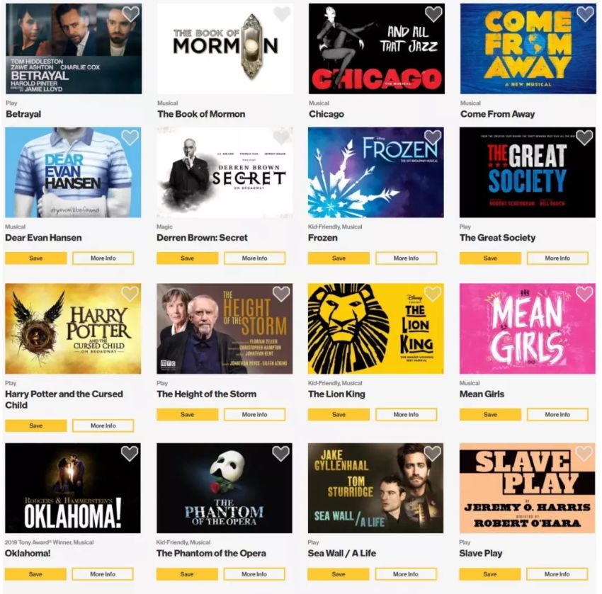 这个网站信息真的是特别全!如果你在纽约呆得时间比较久,可以考虑申请一个会员,交一点年费,就能享受各种低价。之所以把TDF分开讲,是因为TDF和其他的会员相比,实在是太!不!一!样!了!TDF全称Theatre Development Fund(其主管自称这是省钱买票方式中“保守最好的秘密”,现在被我曝出来啦)。有$34的年费(还不到一张票价)就可以买一整年的便宜票!- 剧目丰富,不仅是戏剧、音乐、舞蹈、杂技魔术等各种艺术门类都有,对百老汇来说更是常年有十几到二十部剧目在卖,只要$40-45一张,座位官方宣称是“随机”但是10次里有9次都很好。