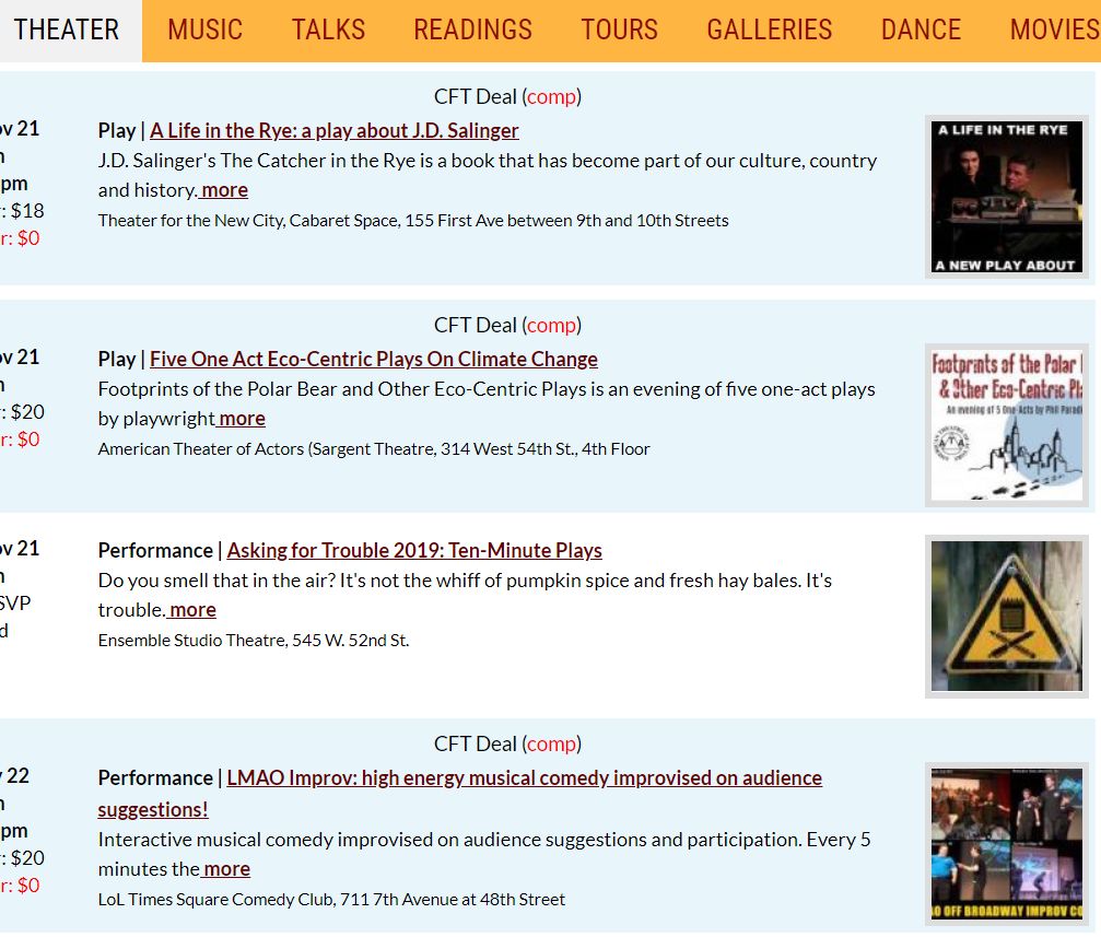 不过嘛就算申不到,还可以结识一下有membership的戏友帮你买票嘛!其他各种的“付会员费享受低价票”的会员组织还有很多。有的像Club Free Time,Will Call Club这些年费便宜($20左右),单张票价低(票面上免费,只收一点手续费),但百老汇很少、主要以小剧场、小型音乐会为主的会员;