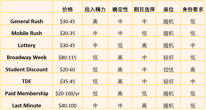 有的方式需要运气和身份加持,比如lottery、学生折扣和tdf,适合常驻纽约客;