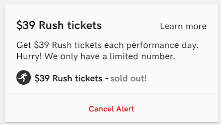 目前的mobile rush全都只在TodayTix(疫情期间一度改成TomorrowTix哈哈哈)一家的APP上,下载就能抢。内啥,TodayTix有没有工作人员在,考虑把广告费结算一下?当然,听上去爽,在家动手把票抢的mobile rush也是有缺点的,首先是剧目选择少,每一季都只有几个并不太大众口味的百老汇,大多数是话剧;