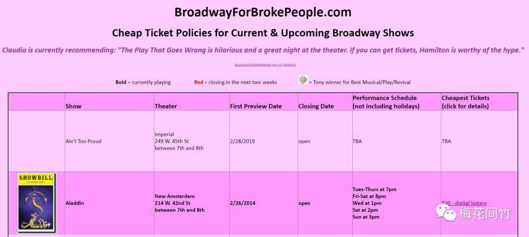 希望是要抱的,万一实现了呢?就算运气差,架不住分母足够大。Rush和Lottery都分享完了,这时候你可能会愁,好多信息,好分散啊,到处都有Lottery信息不知道去哪找该怎么办?如果你坚持看到了这里,那么奖励你,这里介绍一个神奇的网站:5~8~同~城~(并不是)最全的Broadway lottery信息汇总在一个叫www.broadwayforbrokepeople.com的地方。broke people....这个域名无数人自嘲过,但又痛并快乐着地视为珍宝,很符合到处找deal的我和看我找deal的你的自我定位呢。