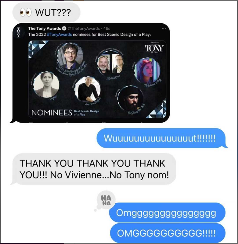 但这些没有那么重要,最重要的是“梅花间竹”的一位忠实读者和活跃群友Vivienne Liu,作为百老汇剧目的Associate Scene Designer,舞台设计的二把手,她参与设计的剧获得了Best Scene Design的提名,也就是她本人获得了提名呀!恭喜优秀“竹友”喜提托尼奖提名,希望后面一切顺利,看能不能6月抱个奖杯回来!