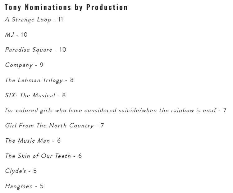 - 《A Strange Loop》获得11项提名名列第一,《Paradise Square》提名10项,而过去两年人气最高、名声最响的《SIX》只有8项提名。