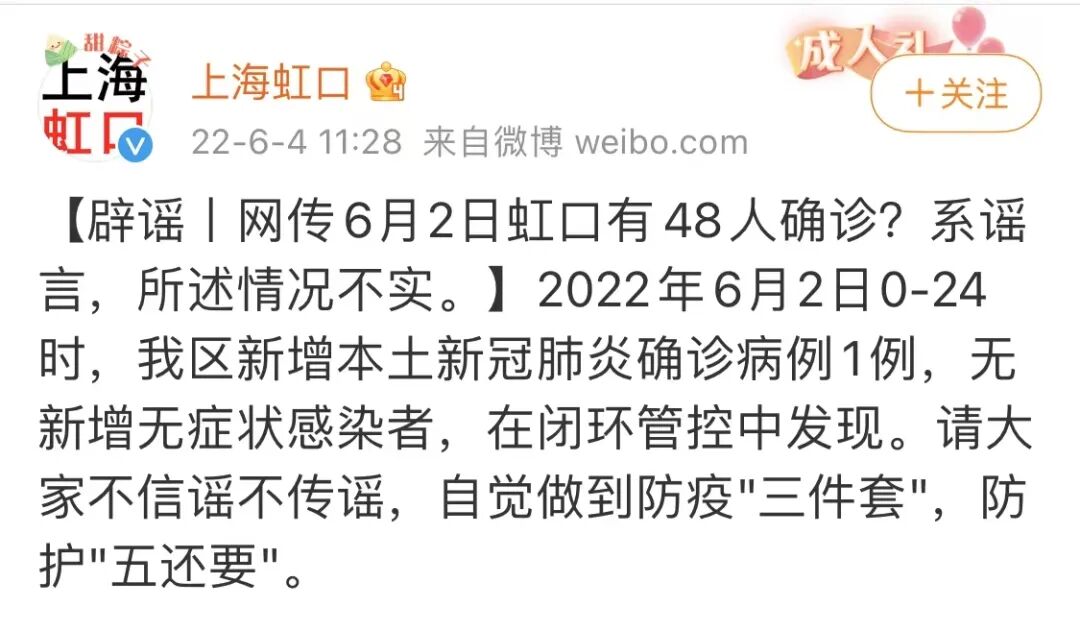 6月5日,上海市公安局发出警情通报称:6月2日晚,网上传播“虹口确诊48个阳性,拉走4栋楼的人”等不实信息。经警方调查,系巢某(女,33 岁)为博取眼球、吸引关注,编造上述谣言并在一微信群中发布,导致该谣言迅速扩散,造成恶劣社会影响。6月4日,巢某因虚构事实扰乱公共秩序的违法行为被虹口警方依法处以行政处罚。
