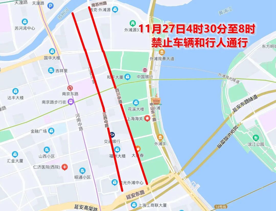 四、11月27日4时30分至8时,江西中路(延安东路—南苏州路)、四川中路(延安东路—南苏州路)、外白渡桥、乍浦路桥和四川路桥禁止车辆和行人通行。