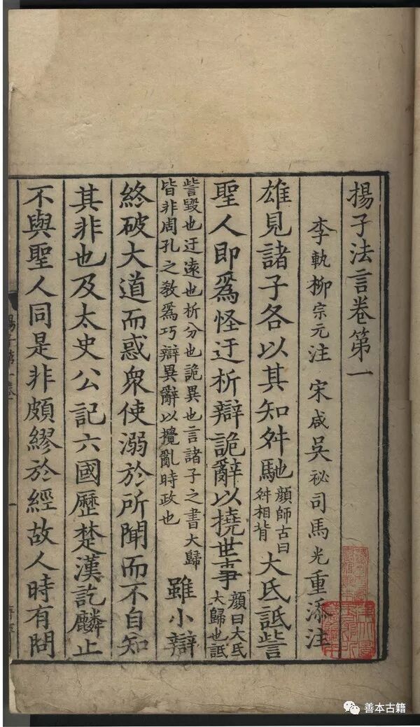 自汉至北宋中期,《扬子法言》之作注有汉侯芭注、吴宋衷注、晋李轨解、隋辛德源注、唐柳宗元注、北宋宋咸重广注及吴祕注等。司马光裒合当时仅存之李轨、柳宗元、宋咸、吴祕四家,形成五臣集注。自是以下,始有五臣注本。宋淳熙八年(1181)刻本《扬子法言》,为五臣注现存最早的刻本。是书精雕初印,棱角峭厉,墨色浓润,为南宋刻书之上品。书中避宋讳极谨密,“玄”、“眩”、“弘”、“殷”、“桓”、“慎”等字皆缺笔,至孝宗讳“慎”字止。书前有淳熙八年唐仲友后序,盖刻书时序也。《钦定天禄琳琅书目后编》曾著录此书,认为系大字麻沙本,为鉴定之误。此书版心下镌有刻工:蒋辉、王定、徐通、李忠、宋琳、吴亮等,皆为绍兴至杭州间刻工,另参考唐仲友之后序,可以认定是书为浙江台州刻本无疑。上世纪80年代,版本学家傅熹年先生曾经眼此书,也认为此书是南宋中期浙江地区所刻之书。