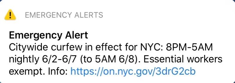 周二晚上8时,纽约就开始宵禁,车经布鲁克林区时,我的手机收到了一条提示: