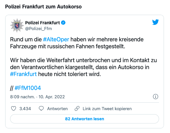 法兰克福警察局官方推特声明。大致意思是说,假如在游行期间有人用俄语说类似于:"顿巴斯是属于俄罗斯的" 的话,可以因此造成刑事犯罪的初步怀疑(赞同国际法意义上的侵略战争)。