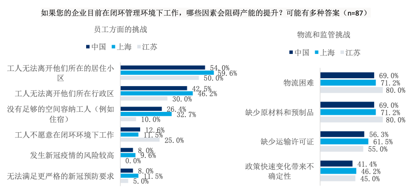 提升产能并非易事。企业表示,以下因素制约了它们的产能: 物流困难(69%)、缺少原材料和预制品 (69%)、缺少运输许可证(56%)、工人不能离开其居住小区(56%)或所在行政区(43%)以及政策快速变化所带来的不确定性(41%)。