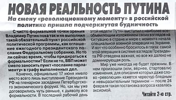 普京眼中的现实。一方面是指俄罗斯军队,它在乌克兰 "平静和不急于求成" 地履行其任务。另一方面是俄罗斯国内的 "集体政府"。文章作者恰当地将其描述为政府和大公司的共生体。这里所传递的信息:一切都在按计划进行,不需要恐慌。