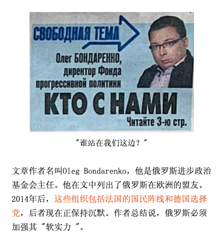 文章作者名叫Oleg Bondarenko,他是俄罗斯进步政治基金会主任。他在文中列出了俄罗斯在欧洲的盟友。2014年后,这些组织包括法国的国民阵线和德国选择党,后者现在正保持沉默。作者总结说,俄罗斯必须加强其 "软实力 "。