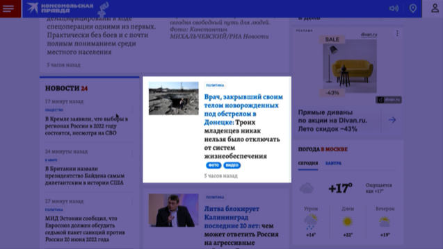 俄罗斯人民被告知,在布查发生的大屠杀是乌克兰为了诋毁俄罗斯而自导自演的。《莫斯科号》军舰实际上是在船上发生事故后才沉没的。俄罗斯军队正在尽一切努力避免平民伤亡。另一方面,俄罗斯媒体称乌克兰士兵躲在人肉盾牌后面。