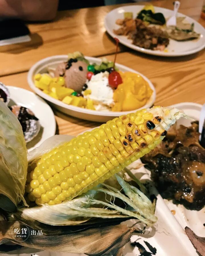很多肉肉,还有烤玉米、各类配菜和面包