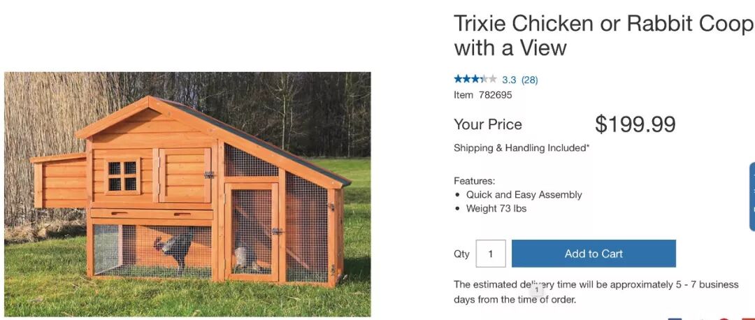 自家装修豪华,如果您家刚好养了几只宠物鸡,想给它们翻新寒舍的话。不用亲自搬砖砌瓦,Costco就能满足您购买一个豪华观景半露天鸡笼的需求。