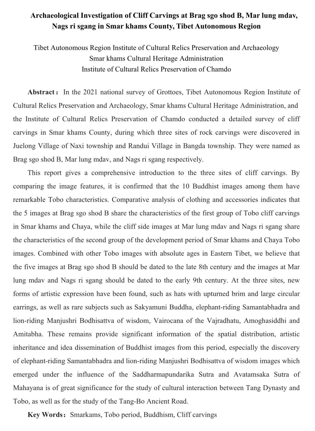摘要:在2021年开展的全国石窟寺(石刻)专项调查工作中,西藏自治区文物保护研究所、芒康县文化局以及昌都市文物保护研究所组成的调查小组对地处西藏东部的芒康县境内的3处摩崖造像进行了调查与记录。3处摩崖造像分别位于芒康县纳西乡觉龙村、帮达乡然堆村境内,共发现11尊造像,通过比较造像特征,确认其中10尊佛教造像具有显著的吐蕃佛教造像风格。这些造像既有新的艺术表现形式,也有罕见的内容题材,它们的发现为进一步研究吐蕃佛教造像的空间分布、艺术传承及思想传播等提供了重要资料,又推动了唐代汉藏文化交流和唐蕃古道的研究,具有重要的学术价值。