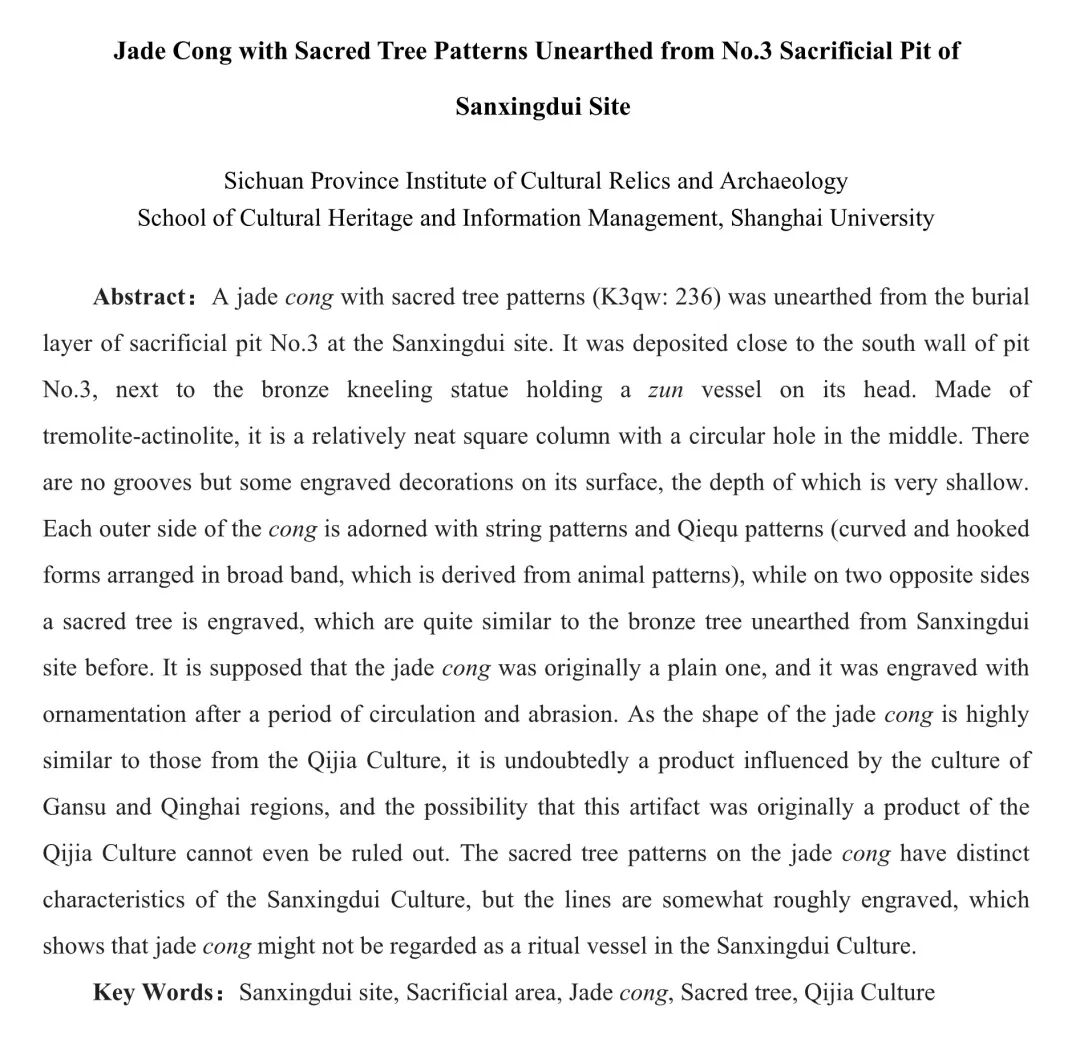 摘要:三星堆遗址祭祀区三号坑遗物埋藏层出土1件神树纹玉琮(K3qw:236),其平面位置靠近三号坑南壁,紧邻青铜顶尊跪坐人像。玉琮材质为透闪石―阳起石玉,整体呈较规整的方柱体,中有周正的圆孔,器表无节槽,有线刻纹饰,刻痕甚浅。玉琮四面均饰弦纹与窃曲纹条带,其中相对的两面各线刻一株神树,形象与三星堆出土青铜神树有颇多近似之处。其原先应为一件素面玉琮,在经历一段时间的流传、磨损后,才被刻上纹饰。器物形制与齐家文化玉琮高度相似,无疑是受甘青地区文化影响的产物,甚至不能排除这件器物原本为齐家文化产品的可能。神树纹饰具有鲜明的三星堆文化特征,雕刻线条却又略显潦草,或说明玉琮在三星堆文化中尚未被视作礼器。