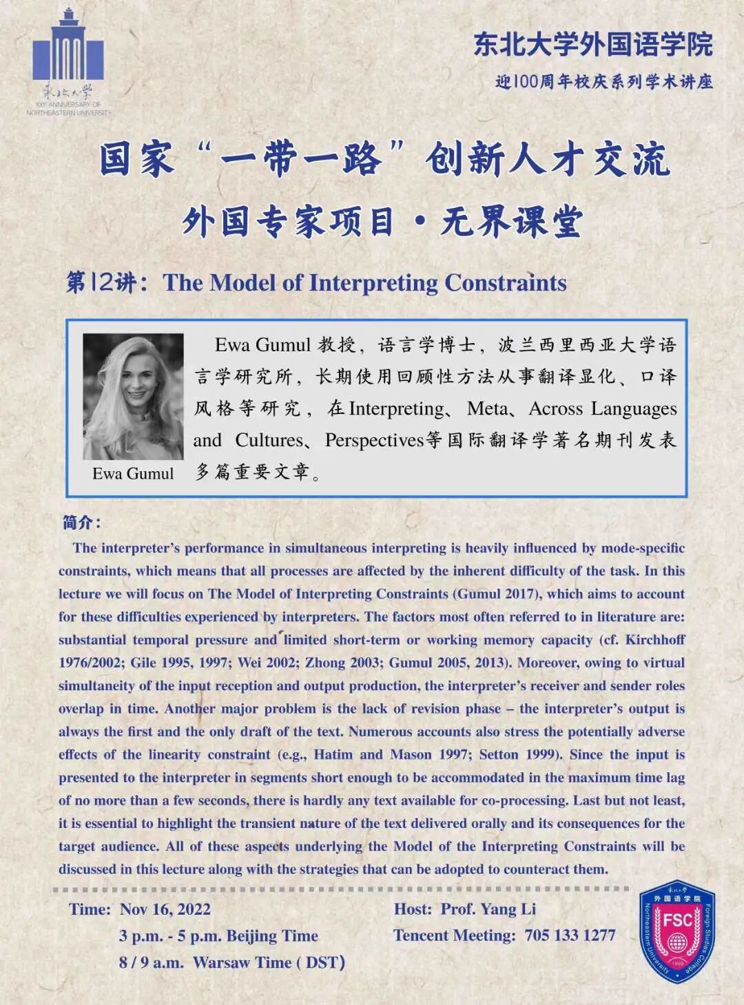 东北大学外国语学院讲座两场(11.9/11.16):Ewa Gumul教授 主讲