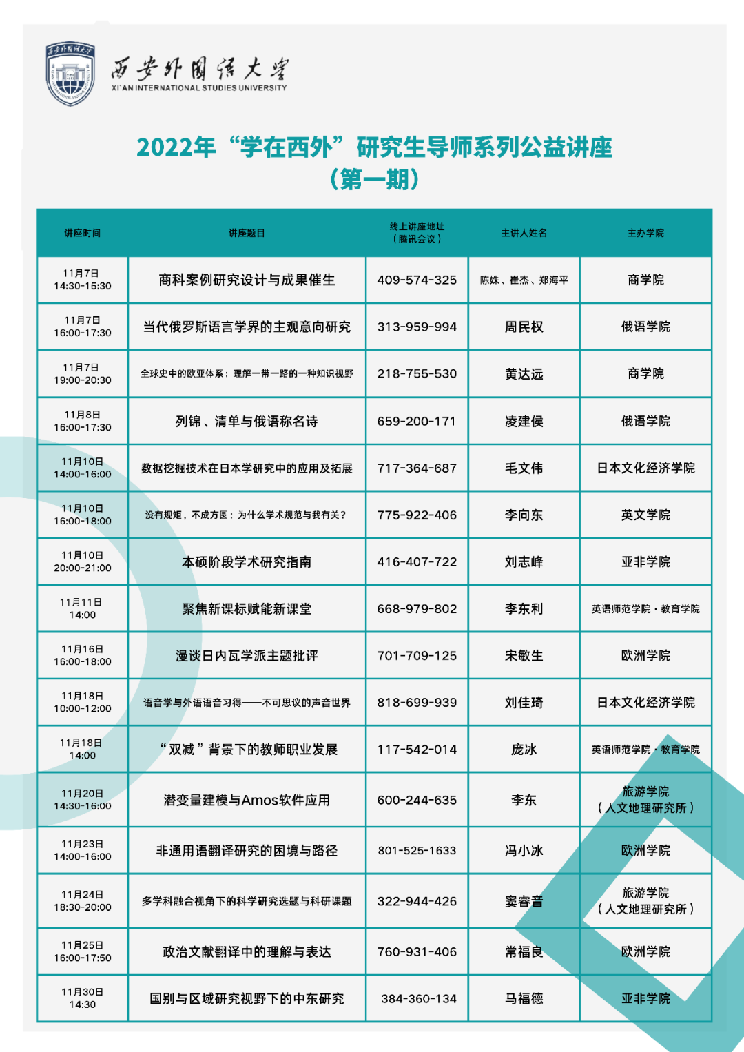 为响应学校《关于在全校开展服务质量提升月活动的通知》号召及要求,为帮助全校研究生更好地开展科学研究,夯实学术基础,提高科研能力,营造校园学术氛围,研究生院·研究生工作部联合各培养学院于11月举办“学在西外”研究生导师系列公益讲座活动,现将第一期系列讲座预告如下。