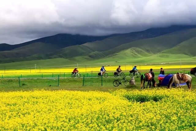 在水天一色的青海湖畔,蜂蝶齐舞的油菜花海里骑行。