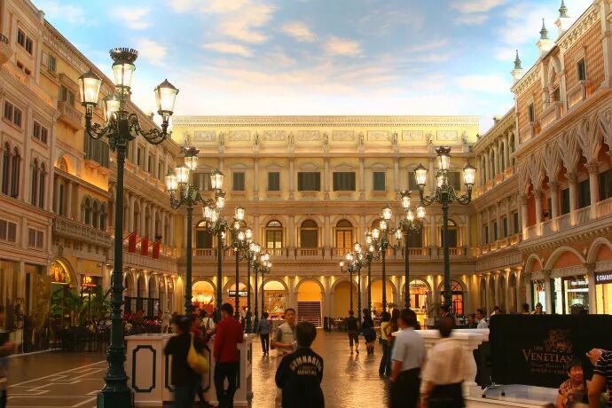 这里建有巨大的“大运河购物中心”,过百家国际名店入驻。室内还建有巨大的人造天空,蓝蓝的天空飘着朵朵白云,即使外面在下雨,在这里也能够心情如春。