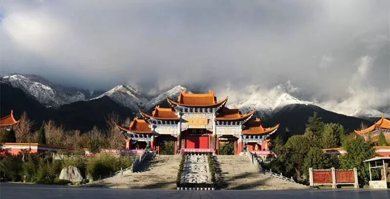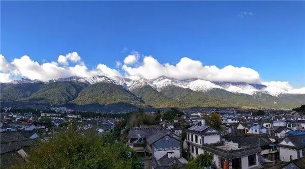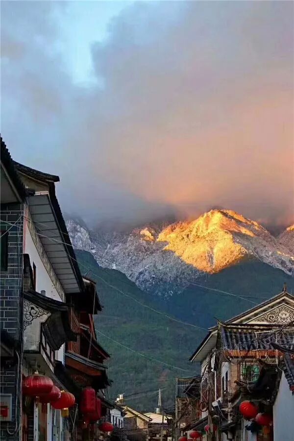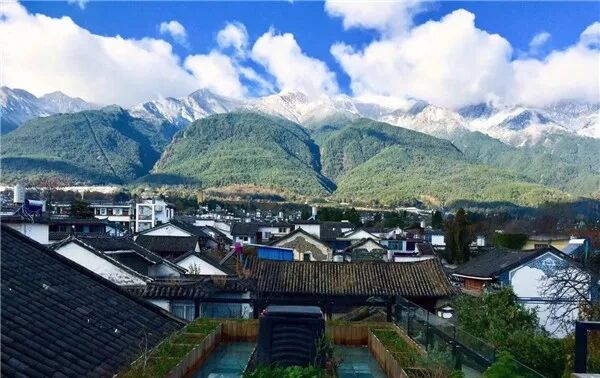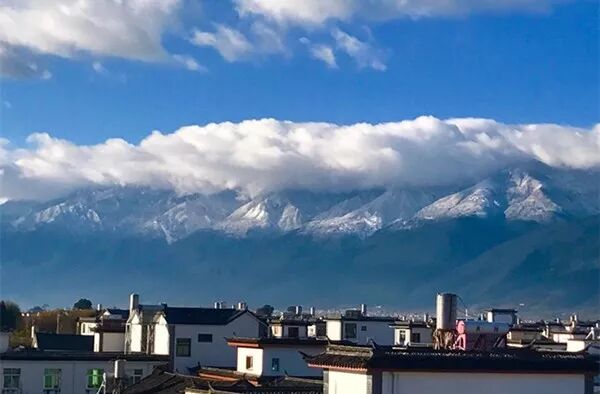 越过屋舍仰望苍山雪景,