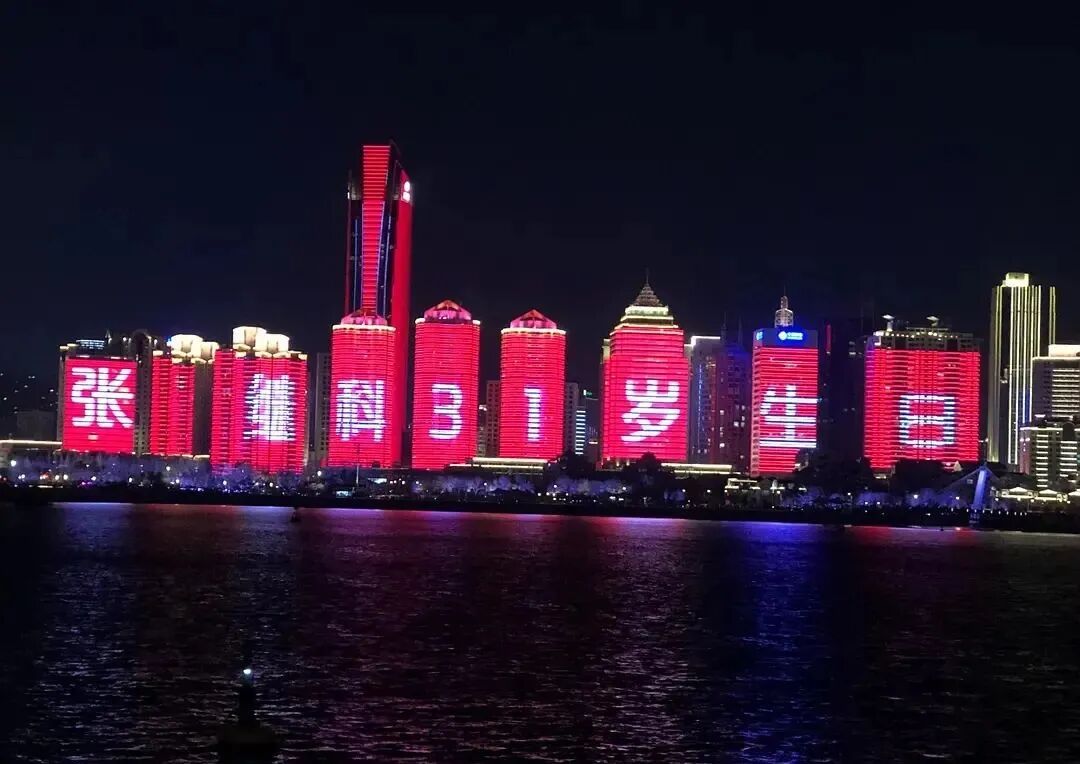 张继科31岁生日时,粉丝们在张继科的家乡青岛组织了一场灯光秀,53栋楼组成了全长5.2公里,总面积48万㎡的庆生标语和图像,场景十分壮观。