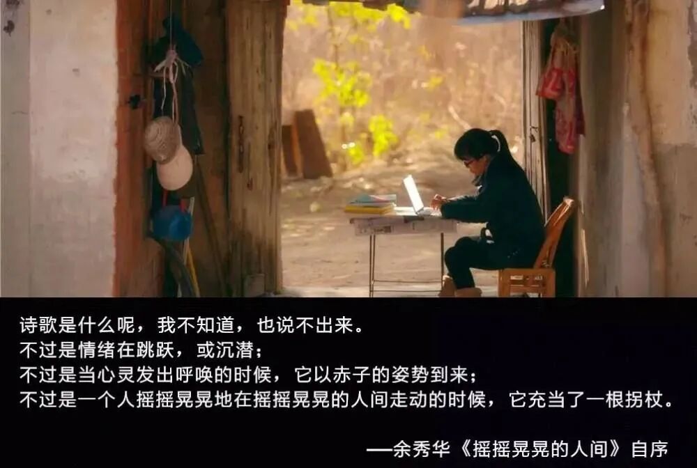 流言蜚语又如何,她说,“喜欢我的人都是高级的,讨厌我的人都是低级的”。是啊,喜欢她的人才会知道,美好不仅仅是花草虫茶,还有尘土,潮湿,泥巴,没有月亮的夜晚。1. 余秀华主演,《摇摇晃晃的人间》,纪录片,由范俭导演(2016年)