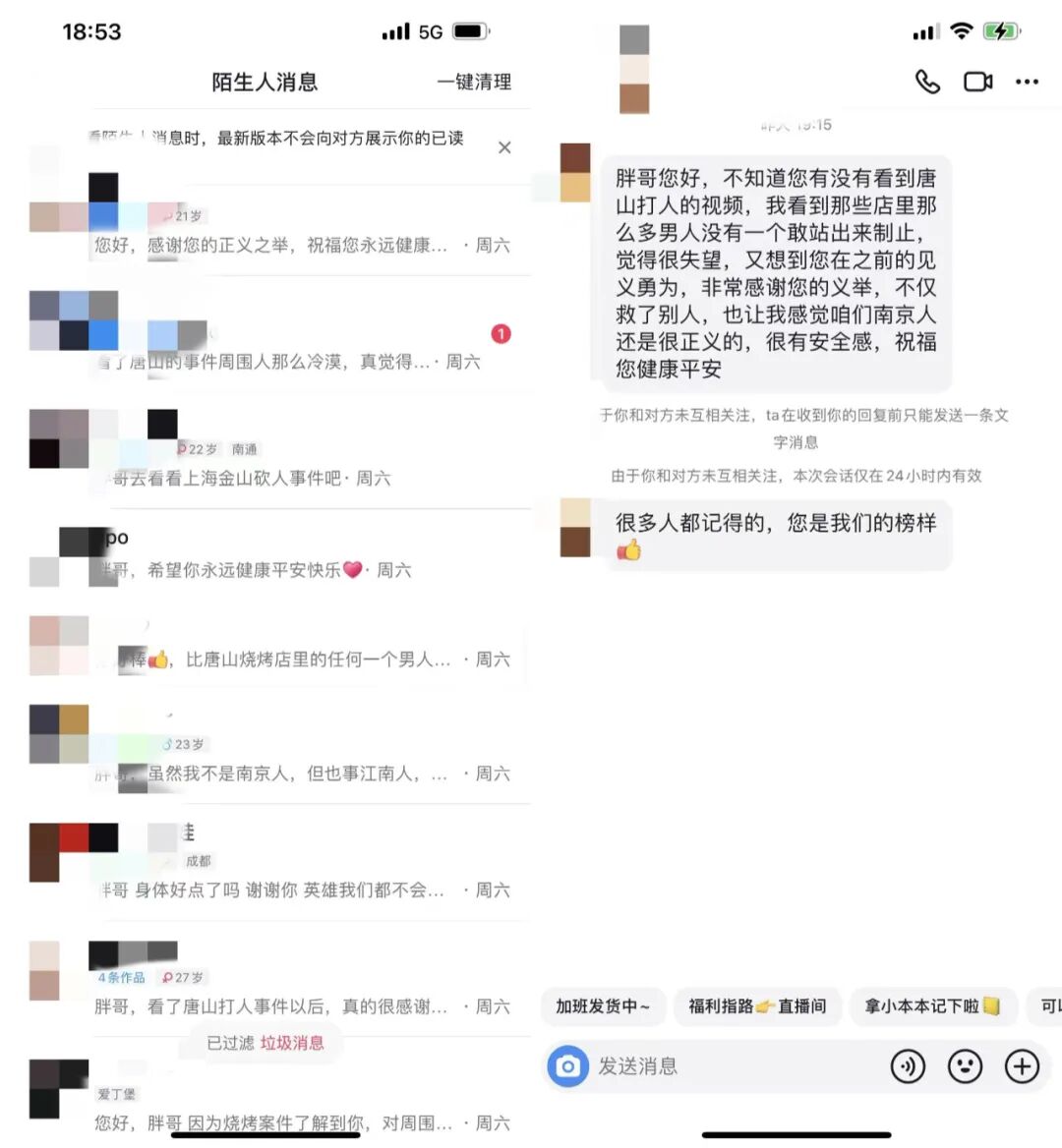 唐山事件后,胖哥抖音账号收到的网友们的私信。