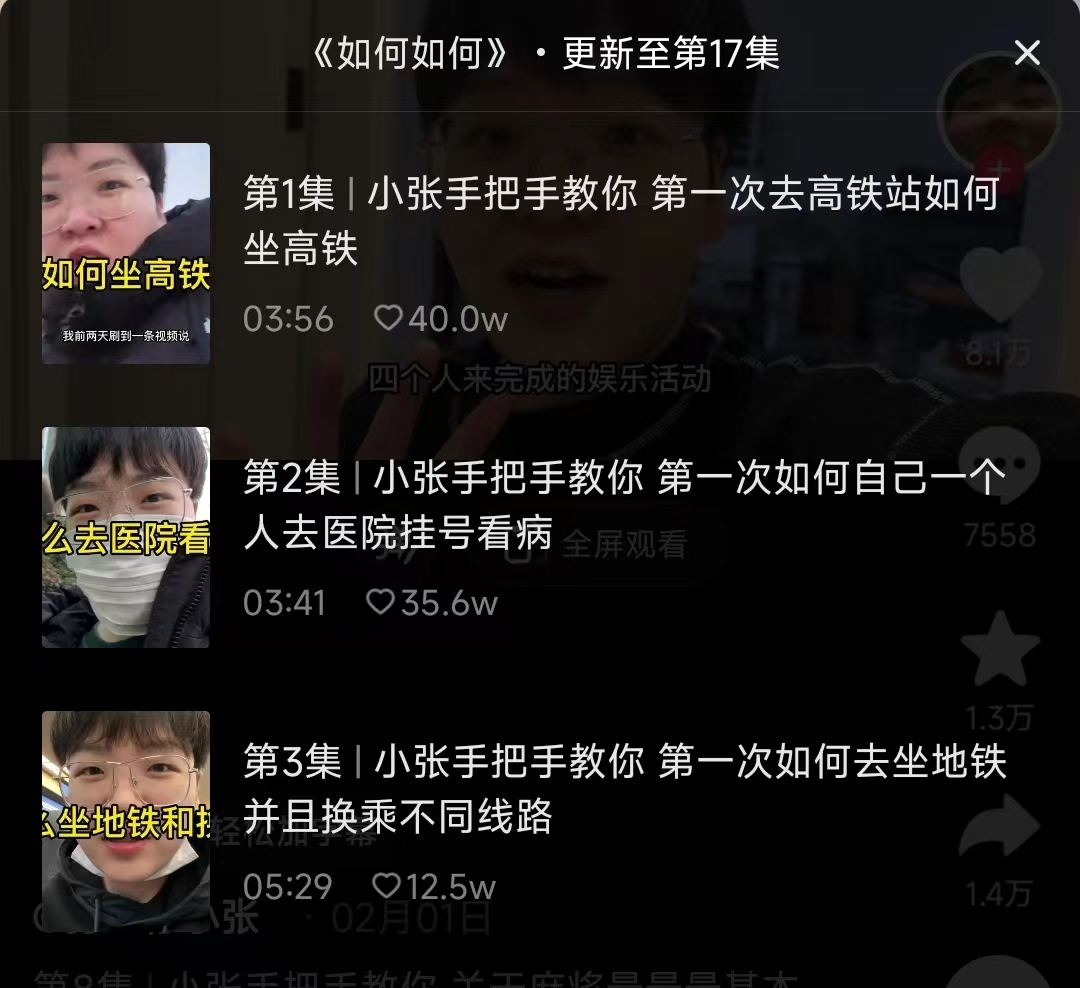 你还记得,你第一次踏进星巴克、海底捞,是怎么摸索着点单的吗?最近,一个名叫“打工仔小张”的抖音创作者走红了。让她出圈的,是一系列名为“如何如何”的视频,内容包括:如何坐高铁、如何坐飞机、如何一个人看病、如何在星巴克点单……“虽然感觉好像没有什么人会需要看这个,但是万一呢,万一有人需要呢?”视频发布,反馈却让人惊讶。评论区,全都是真诚感谢博主的网友:他们往往来自县城甚至更偏远的地区,很多人从来没出过自己所在的城市,坐高铁,对他们来讲不啻于一场冒险: