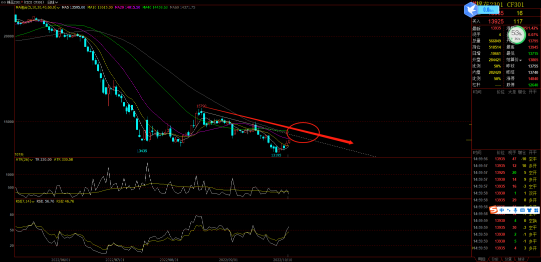 1、农产品棉花向上突破了13800,我不能继续看空棉花了,这里要反弹一下了,现在这样的形态向上突破也是很难的,我觉的14400附近可能会出现压力。
