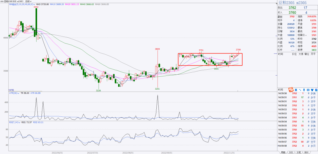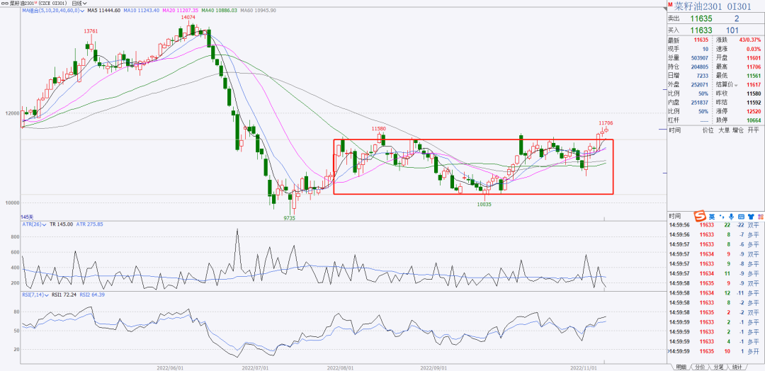 2、油脂板块形态比较明显的是郑油,已经向上突破矩形区间,可以等待标k出现之后做多。
