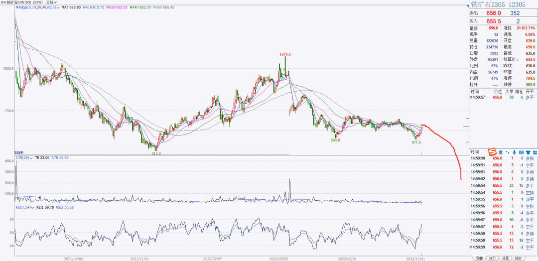 3、铁矿虽然反弹比较猛,但是60均线附近是重要压力位,05的形态弱一点,我在60均线附近等待做空。