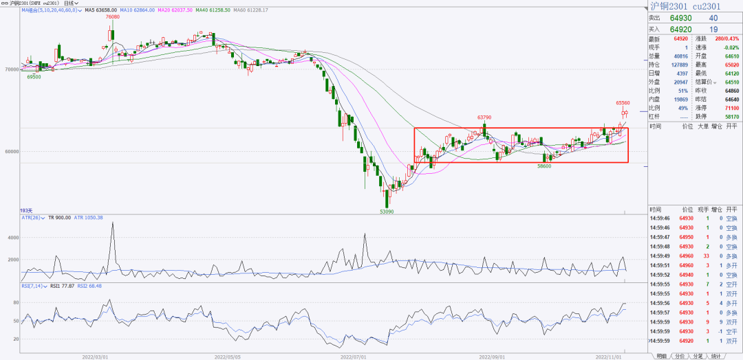 1、沪铜向上突破了震荡区间,等待标K形态参与多单。