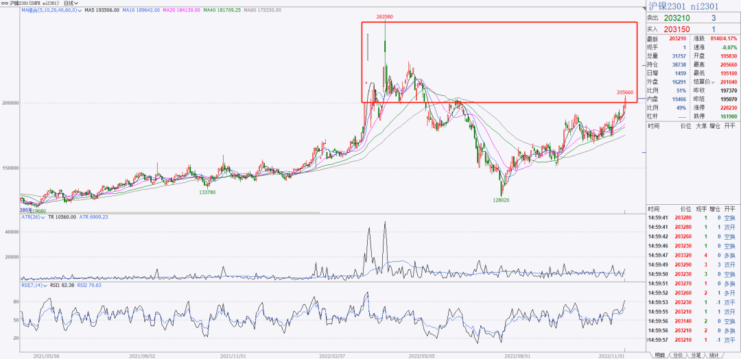 3、沪镍均线多头排列,今天增仓大涨收盘阳线,虽然看多但是不追多。上方压力位越来越近了,看戏吧。