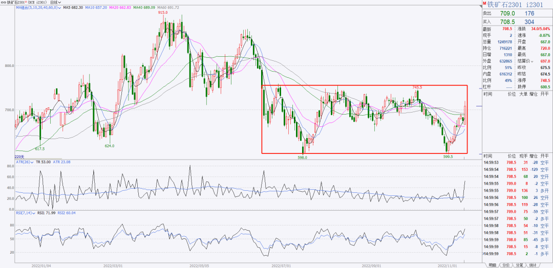 3、铁矿05从10月11日到10.31日是下跌一浪,到今天是反弹2浪,今天的长阳线太长了,2浪过于大了,不能用123浪的形态去分析了,今天的长阳说明现在的形态不是一个123浪,正常的2浪没有这么长。现在我只能认为铁矿是震荡了,放弃操作的想法。