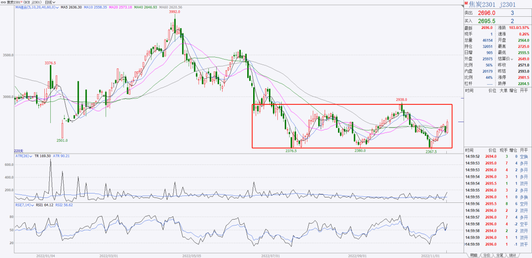 2、焦炭从10月11日到11月2日的下跌可以看成是一浪,11月2日到今天可以看成是反弹2浪,今天的阳线说明反弹2浪没有走完,这个形态是要宽幅震荡了,不等三浪了,现在没有操作想法,只观望。